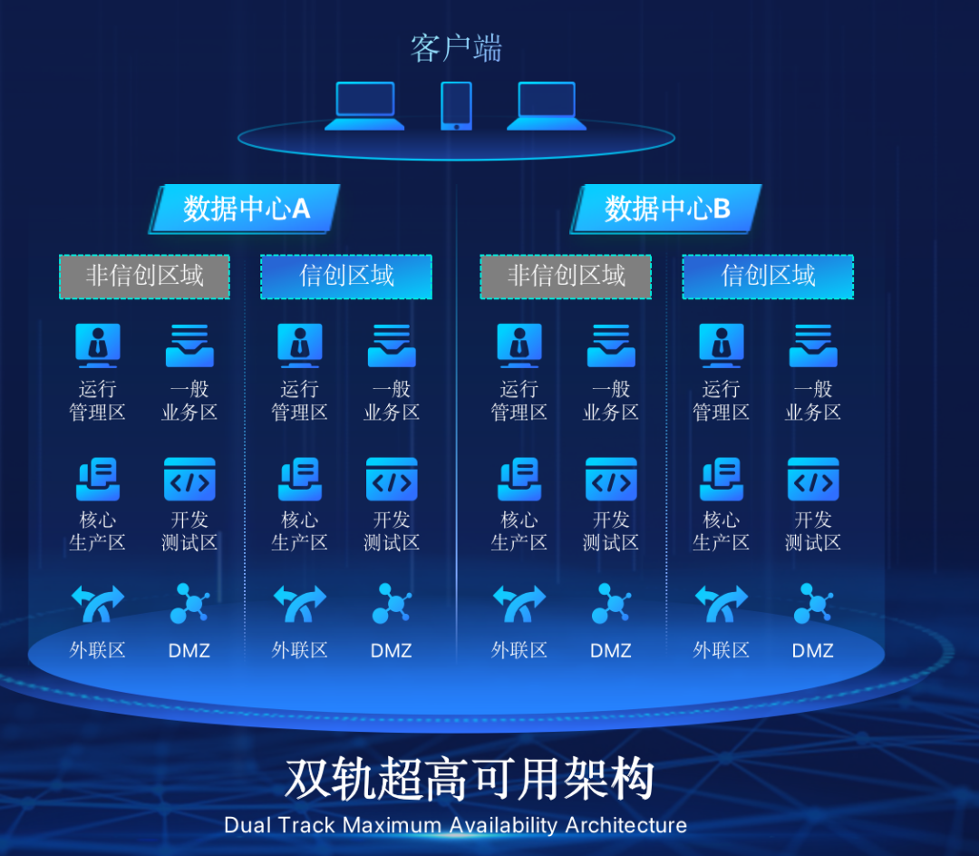 SG·亚洲胜游在企业面临自主创新IT基础重构过程中,推出的全新架构双轨超高可用架构(简称DTMAA),在双活数据中心的分区调度基础上,添加每个数据中心内信创域和非信创域的分域调度,来实现分区分域协同的多活双轨超高可用。