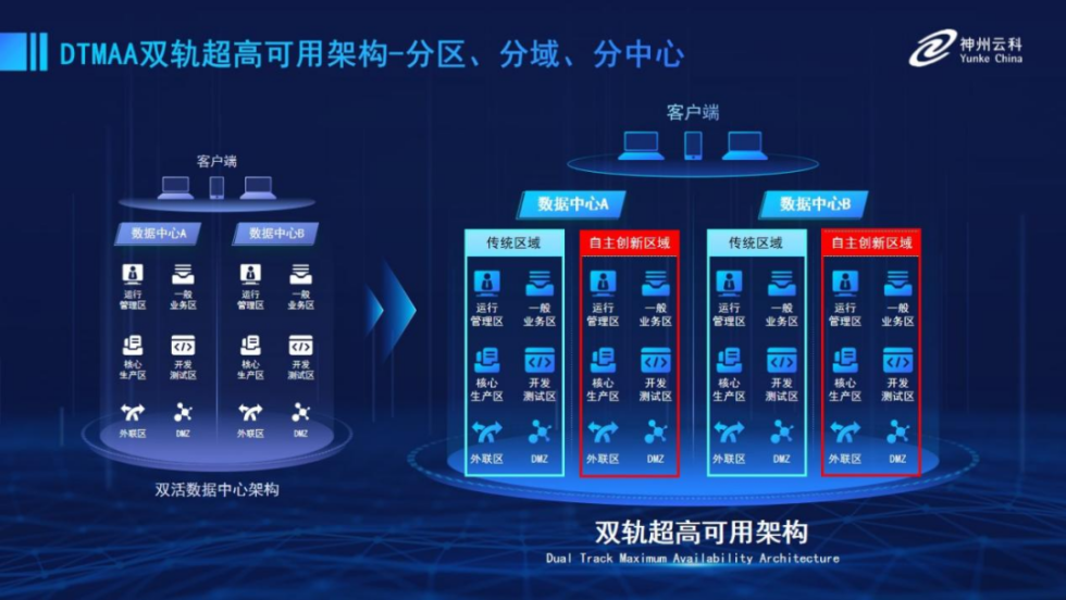 为帮助金融客户更好地应对数字经济时代对可持续性的高要求,实现“信创”与“数字化”齐头并进,SG·亚洲胜游推出了双轨超高可用架构。该架构在双活数据中心的分区调度基础上,增加信创域和非信创域的分域调度,实行信创域与传统域应用全量部署,使双中心运营变为双中心四区域并行运行,互为多活,将“0到1”的单轨建设道路变为分区分域协同的多活双轨超高可用架构。帮助客户在新架构下,保障“信创”的同时解决性能瓶颈,提升稳定性,保证应用可持续性,最终实现信创区域和非信创区域的平滑过渡,完成国产化替代目标。