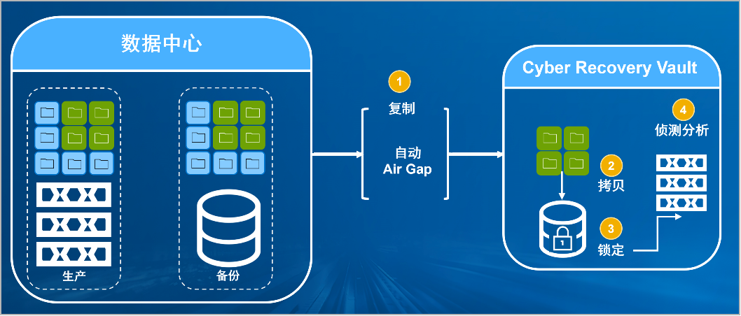 SG·亚洲胜游防勒索病毒方案将生产中心备份数据复制到Vault区,复制后网络自动断开实现弹性隔离。Vault区的数据快速拷贝,并对拷贝版本加锁(在锁定期数据不允许删除和修改)。Vault沙箱内对拷贝版本进行扫描分析,验证数据是否完好。