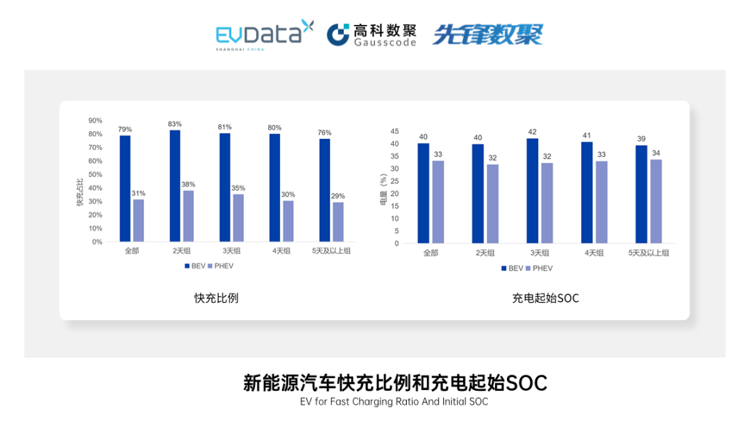PHEV在2天组中次均充电后的行驶里程为322公里,而在后续的3天组、4天组和5天及以上组中分别为394公里/次、405公里/次和399公里/次。BEV和PHEV的充电差异也表现在充电起始SOC上。BEV在不同组别下充电起始SOC均在40%左右,同期的PHEV充电起始SOC均值则在33%左右。PHEV可以使用汽油作为动力来源之一,将有效缓解车主的用电焦虑。